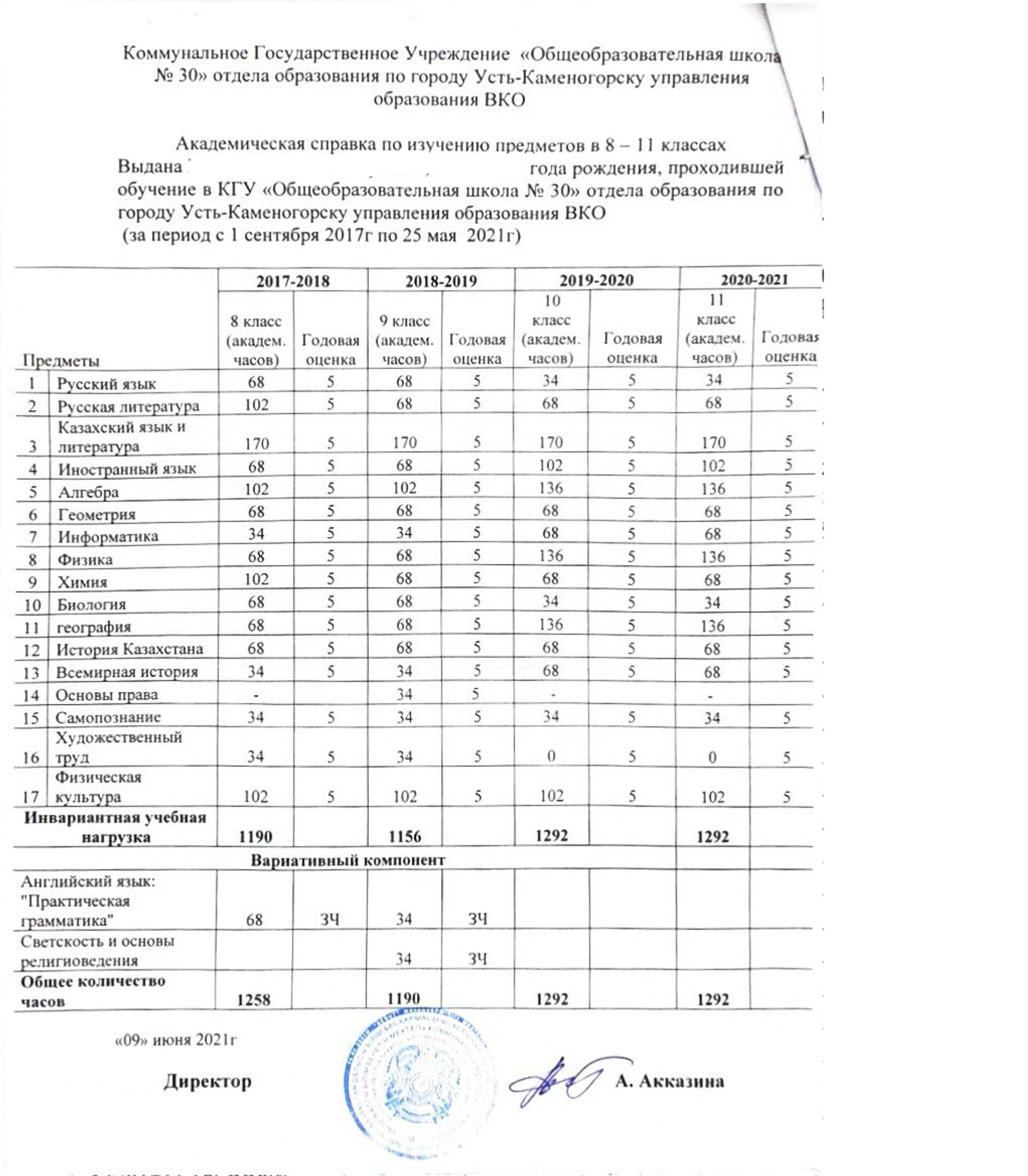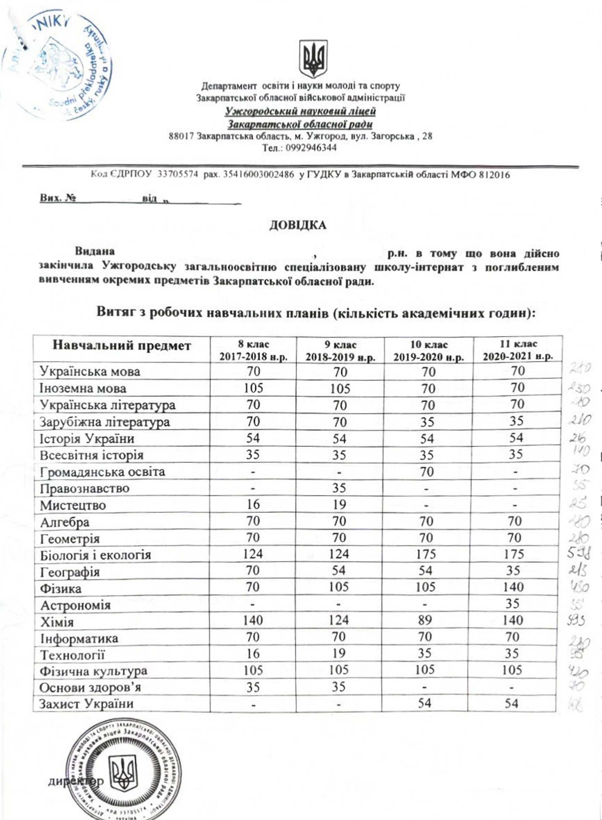- Академическая справка с часами и оценками за последние 4 года обучения, переведенная и заверенная аналогичным образом. (см. фото 1-3)