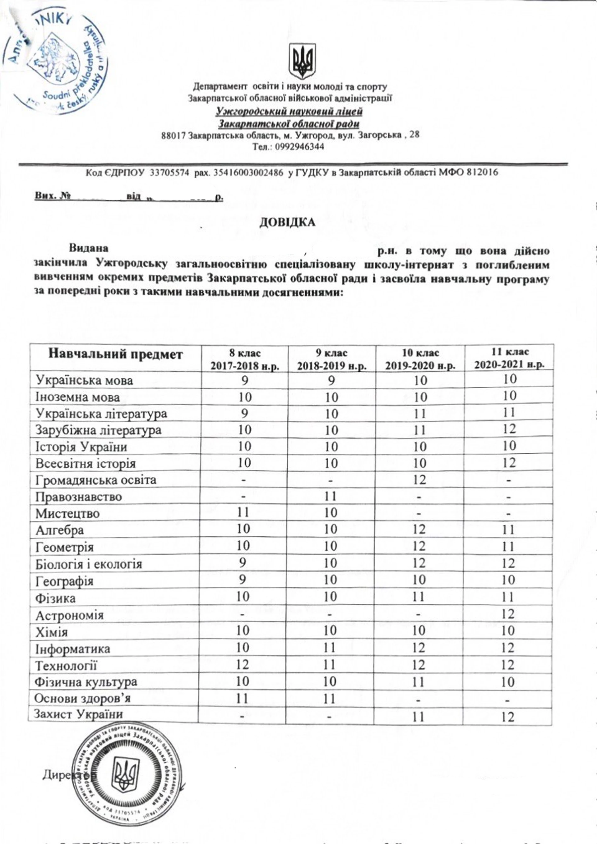 - Справка о количестве часов обучения и оценках за последние 4 года в школе: Этот документ демонстрирует объём и глубину вашего обучения по различным предметам, позволяя университету сравнить его с чешской образовательной программой.