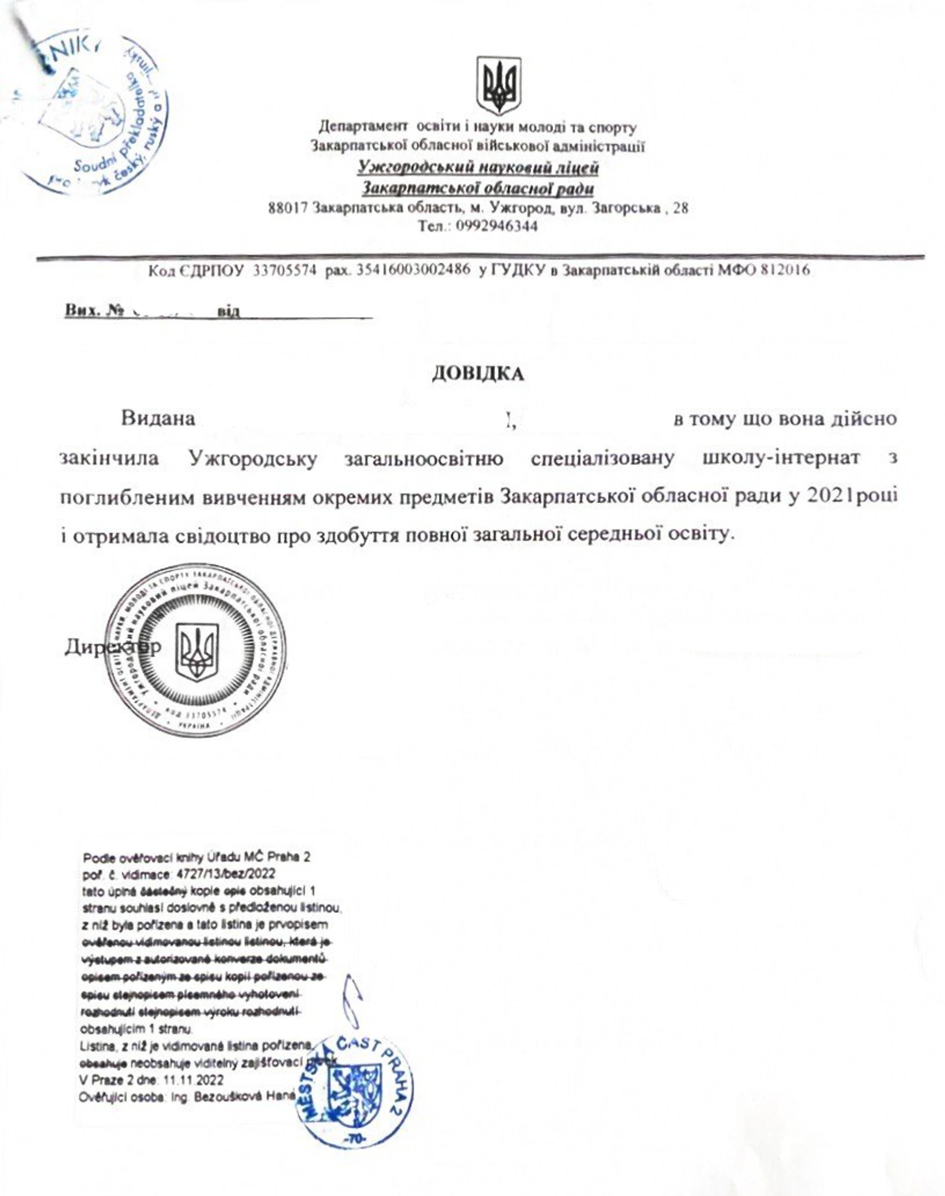 Необходимыe документы для нострификации аттестата в Чехии: